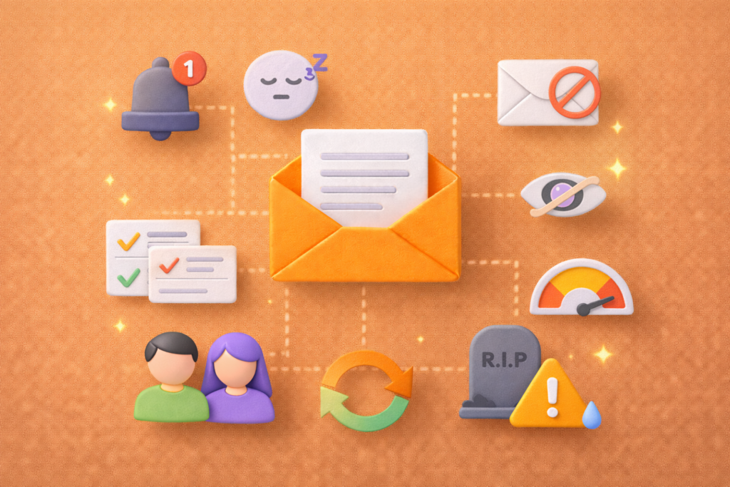 اگر برند برای مدتی طولانی (۶–۹ ماه) ایمیل نفرستاده باشد، کاربر احساس میکند برند دیگر فعال نیست یا ارزش وقت گذاشتن ندارد. اما چون قبلاً رضایت داده، ایمیل را نگه میدارد تا «اگر روزی برگشتند، ببینم».